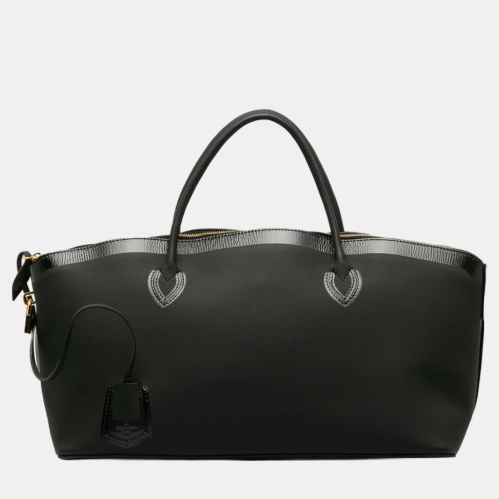 Q: What material is the Louis Vuitton Black Leather Lockit East-West Handbag made from?