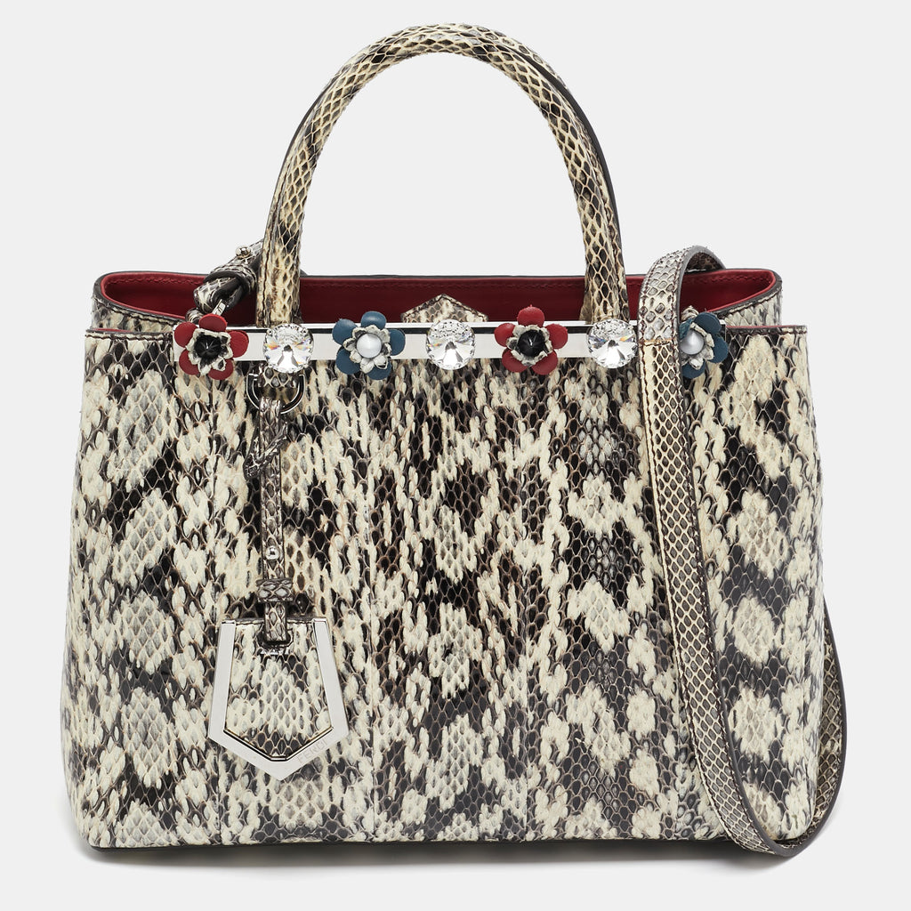 Discover the exquisite Fendi Black/White Snakeskin Leather Small Flowerland 2Jours Tote, a stunning example of designer luxury handbags. Crafted from premium snakeskin leather, this tote combines elegance and practicality, making it perfect for any occasion. With its chic design and versatile color scheme, it elevates any outfit. When you buy luxury handbags online, use our price comparison platform to find the best deals on this iconic piece. Trust in Fendi's renowned quality and luxury, and enjoy peace of mind knowing you're making a well-informed purchase. Explore our site for trusted information and elevate your handbag collection today.