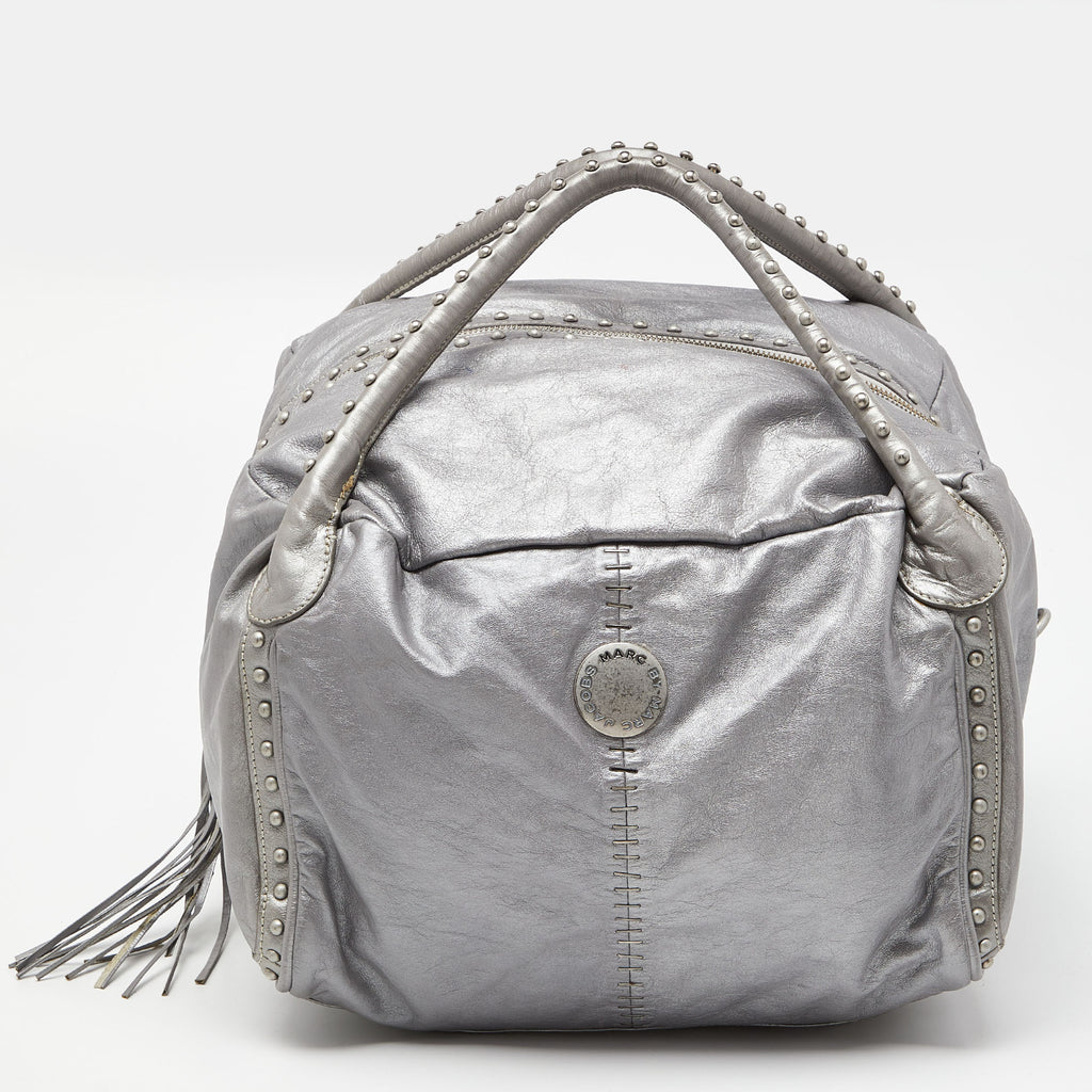 Q: What unique features does the Marc Jacobs Grey Leather Studded Hobo offer?