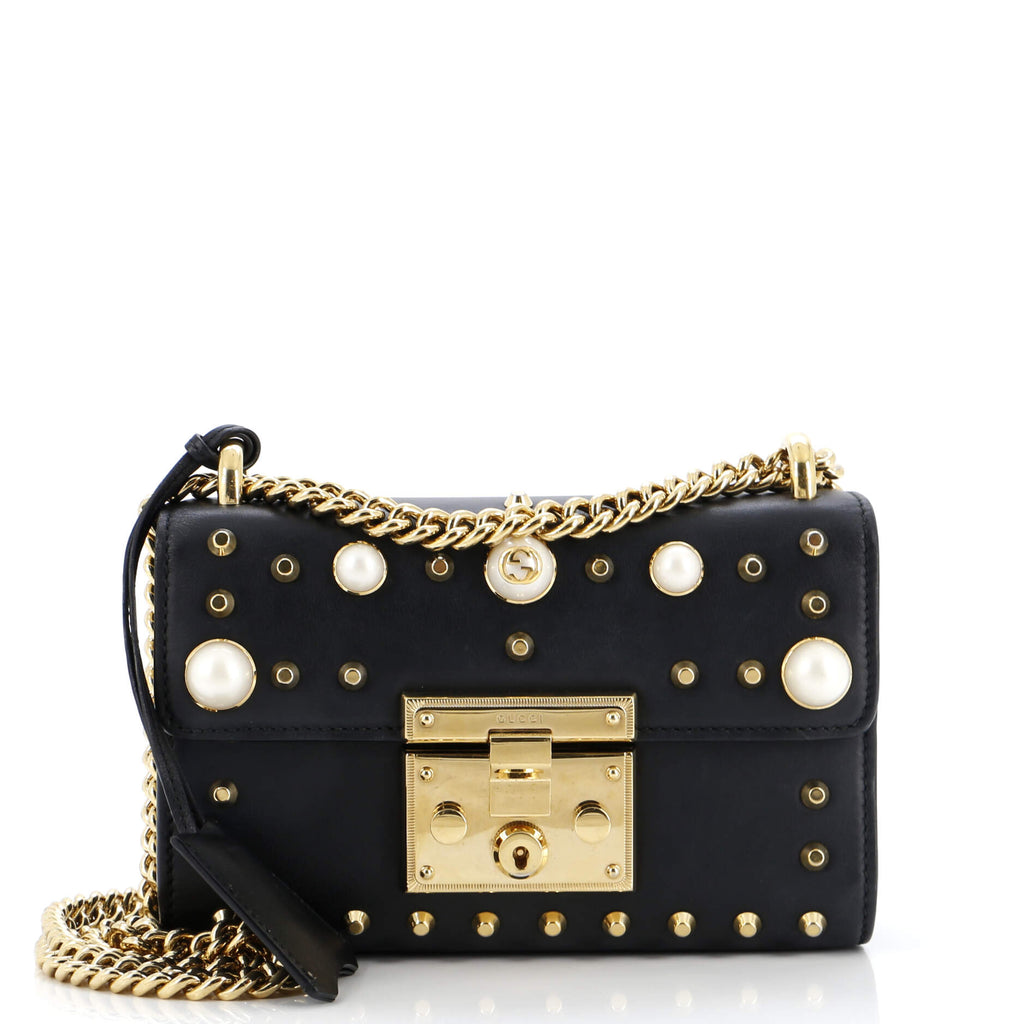 A: The Gucci Pearly Padlock Shoulder Bag boasts unique features such as its studded leather design, which adds a modern edge to a classic silhouette. The iconic padlock closure not only serves as a security measure but also enhances the bag's overall aesthetic, making it a statement piece in any wardrobe.