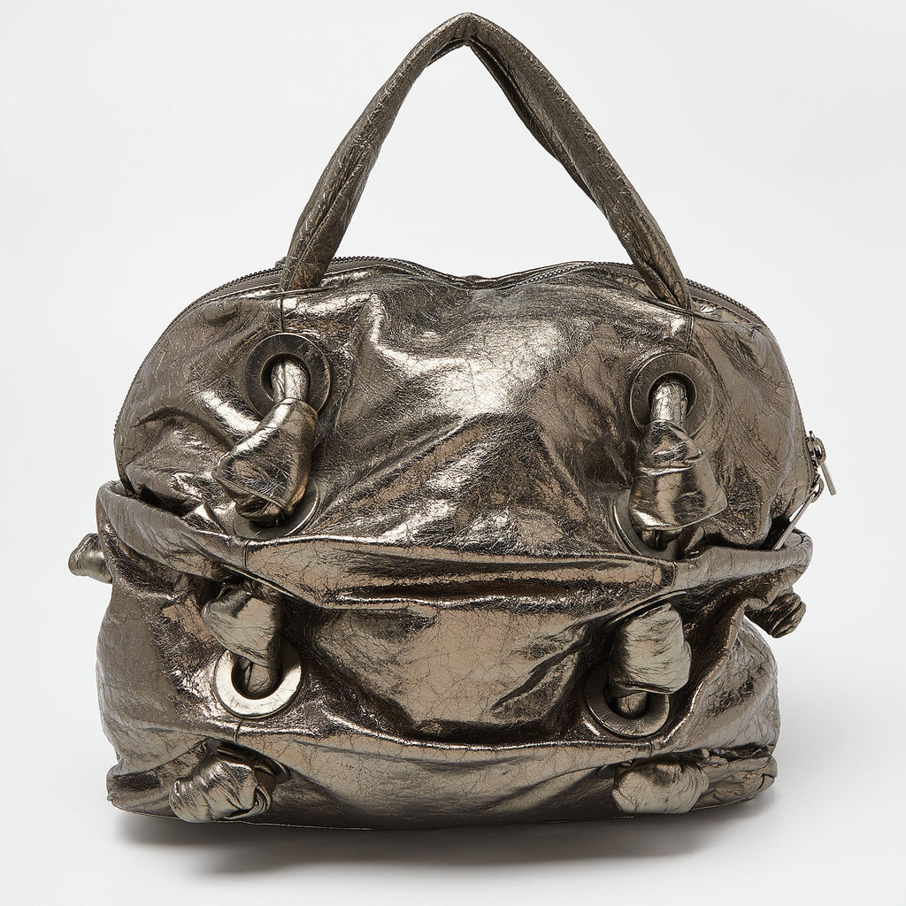 Q: What materials are used in the Michael Kors Metallic Gathered Leather Zuma Bag?
