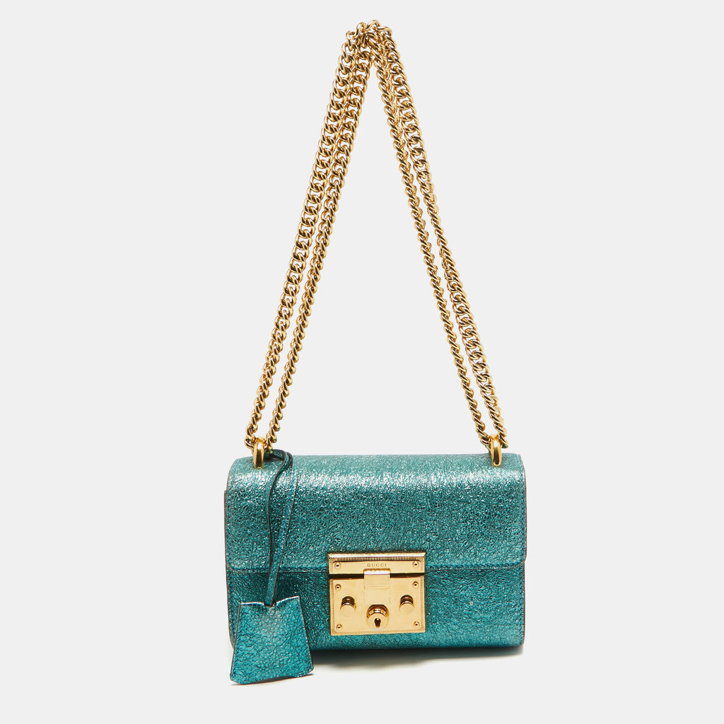 Discover the Gucci Metallic Teal Crinkled Leather Small Padlock Shoulder Bag, a stunning addition to any collection of designer luxury handbags. Crafted from high-quality materials, this bag features a unique crinkled leather finish that showcases Gucci's renowned craftsmanship. Perfect for both style and practicality, it offers an elegant design suitable for any occasion. If you're looking to buy luxury handbags online, our price comparison platform simplifies your search, ensuring you find the best deals. Trust our expertise to guide you in choosing a reputable brand like Gucci, known for its luxury and quality. Explore your options today and elevate your style.