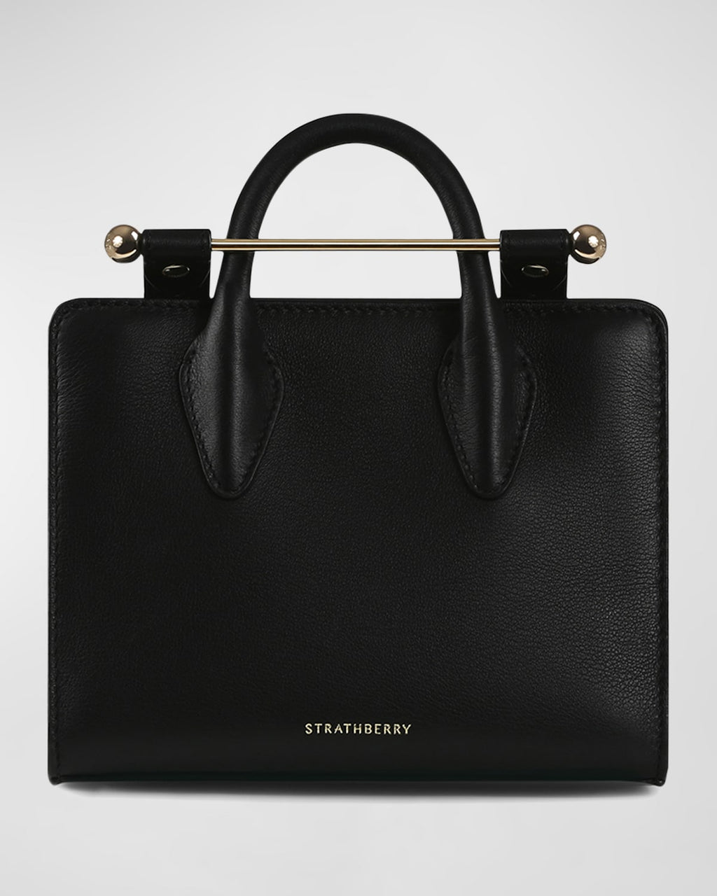 Q: What unique features set the Strathberry Nano Metal Bar Leather Tote Bag apart from other designer luxury handbags?