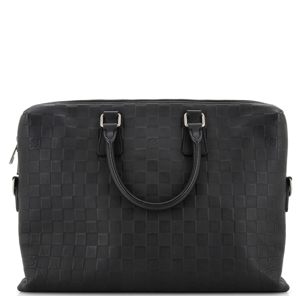 A: The Louis Vuitton Porte-Documents Jour Bag is crafted from Damier Infini leather, a refined and durable material that showcases Louis Vuitton's commitment to luxury and quality. This leather is known for its resistance to wear and tear, making it an ideal choice for a stylish yet functional designer luxury handbag.