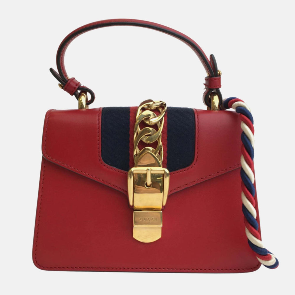 A: The Gucci Red Leather Mini Sylvie Shoulder Bag is crafted from high-quality Italian leather, known for its durability and luxurious finish. The bag features a smooth texture that enhances its elegant appearance, making it a standout piece among designer luxury handbags.