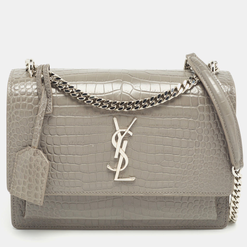 Discover the Saint Laurent Grey Croc Embossed Leather Medium Sunset Shoulder Bag, a stunning blend of luxury and practicality. Crafted from premium materials, this designer luxury handbag showcases a sophisticated embossed finish, making it a must-have accessory for any fashionista. When you buy luxury handbags online, our price comparison platform ensures you find the best deals available. With Saint Laurent Paris's esteemed reputation for quality and design, you can trust this bag to elevate your style. Explore our site for expert insights and trusted information on luxury handbags, helping you make informed purchasing decisions. Elevate your collection today.