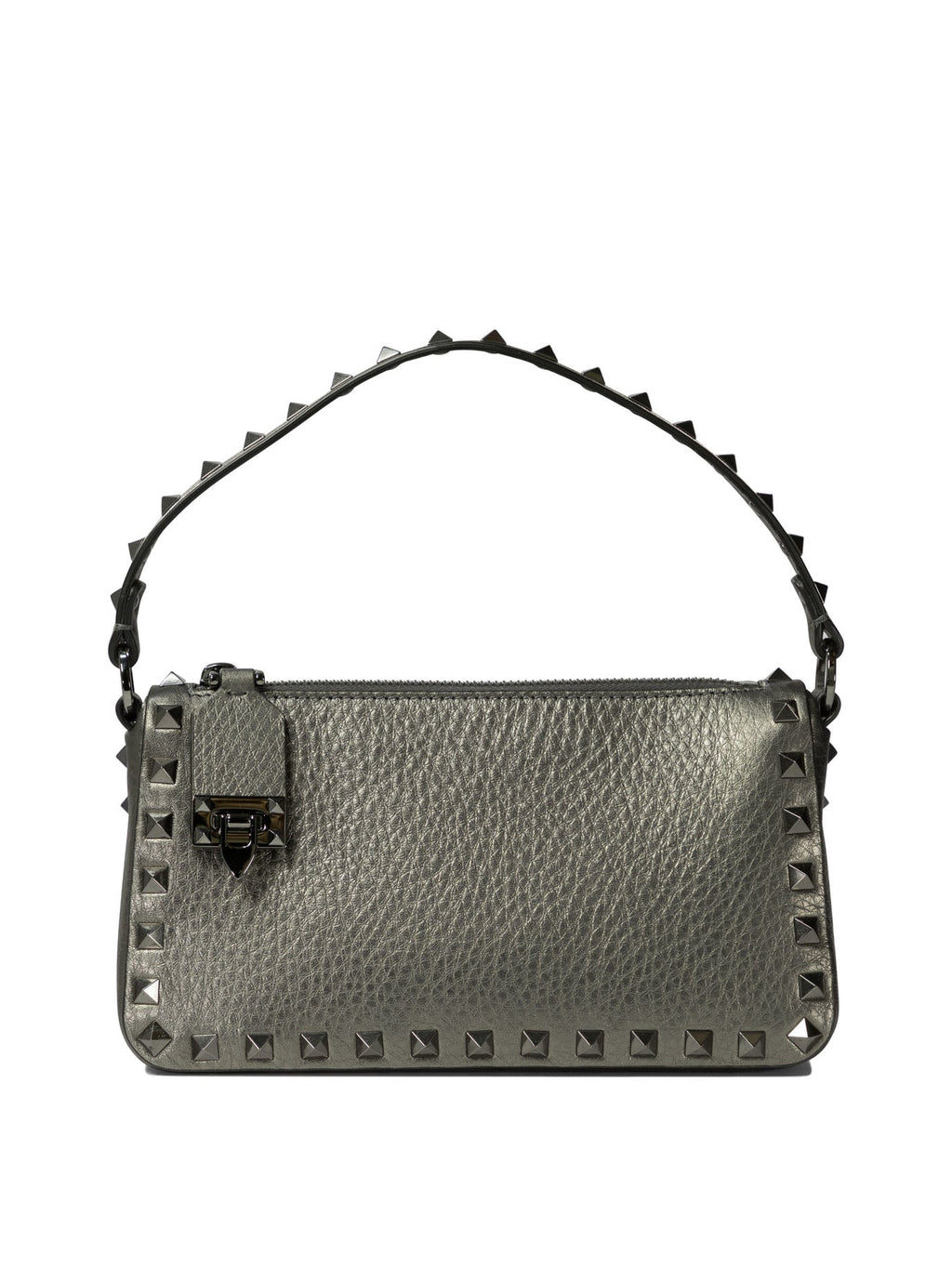 A: The Valentino Garavani Women's Rockstud Small Shoulder Bag is crafted from high-quality leather, providing durability and a luxurious feel. The iconic Rockstud embellishments are made from polished metal, adding a distinctive touch to this designer luxury handbag.