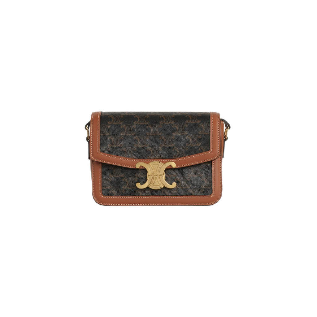 A: The Celine Women's Triomphe T-Shirt Bag is crafted from high-quality leather, known for its durability and luxurious feel. This designer luxury handbag showcases Celine's commitment to exceptional craftsmanship and premium materials, ensuring both style and longevity.