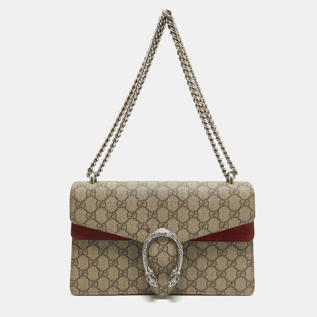 Discover the Gucci Beige/Red GG Supreme Canvas and Suede Small Dionysus Shoulder Bag, a stunning blend of style and practicality. This designer luxury handbag features a signature GG Supreme canvas and luxurious suede, ensuring both quality and sophistication. Ideal for any occasion, its versatile design complements various outfits. When you buy luxury handbags online, utilize our price comparison platform to find the best deals, ensuring you get the most value for your investment. Trust in Gucci's esteemed reputation for excellence and craftsmanship. Our site provides reliable information to help you make informed decisions in your luxury handbag journey.