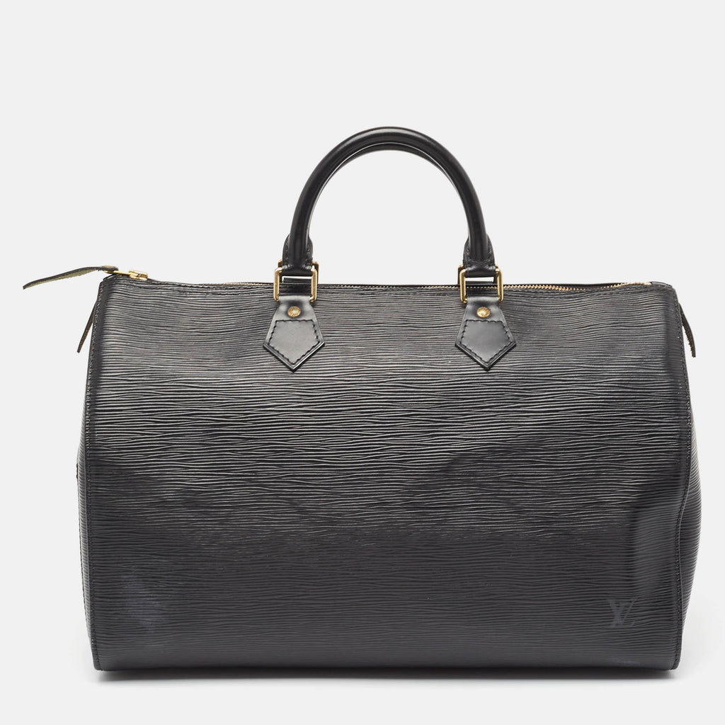 A: The Louis Vuitton Black Epi Leather Speedy 35 Bag is crafted from high-quality Epi leather, which is known for its durability and unique texture. This leather is made using a special stamping process that enhances its strength while providing a stylish, sophisticated look that is characteristic of designer luxury handbags.