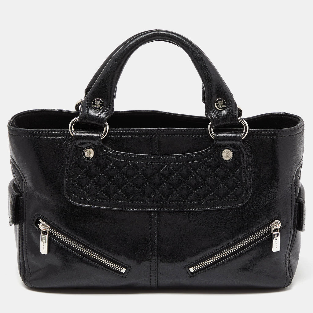 Q: What unique features does the Celine Black Quilted Glossy Leather Boogie Tote offer?