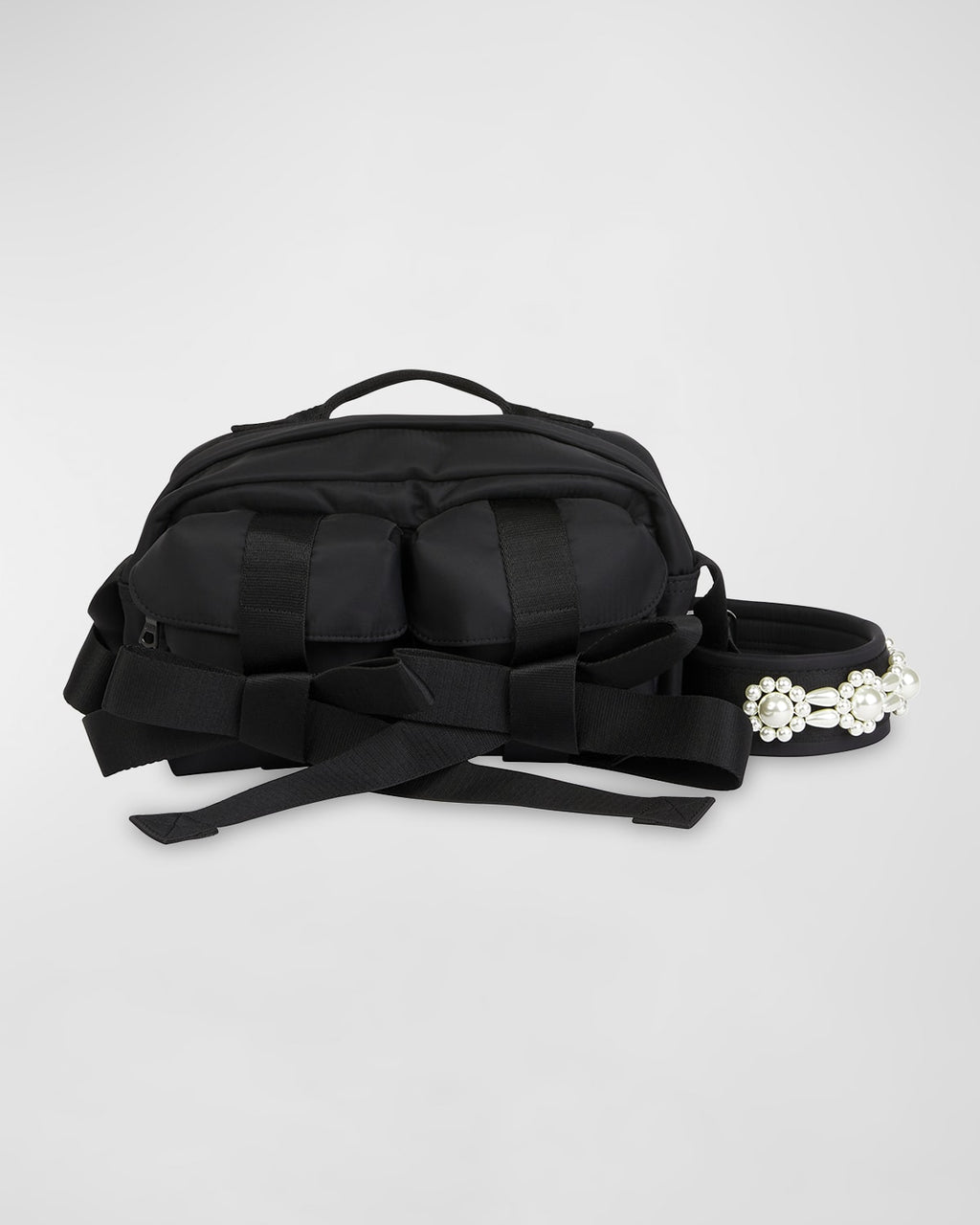 Q: What are the functional features of the Simone Rocha Bow Zip Bum Crossbody Bag?