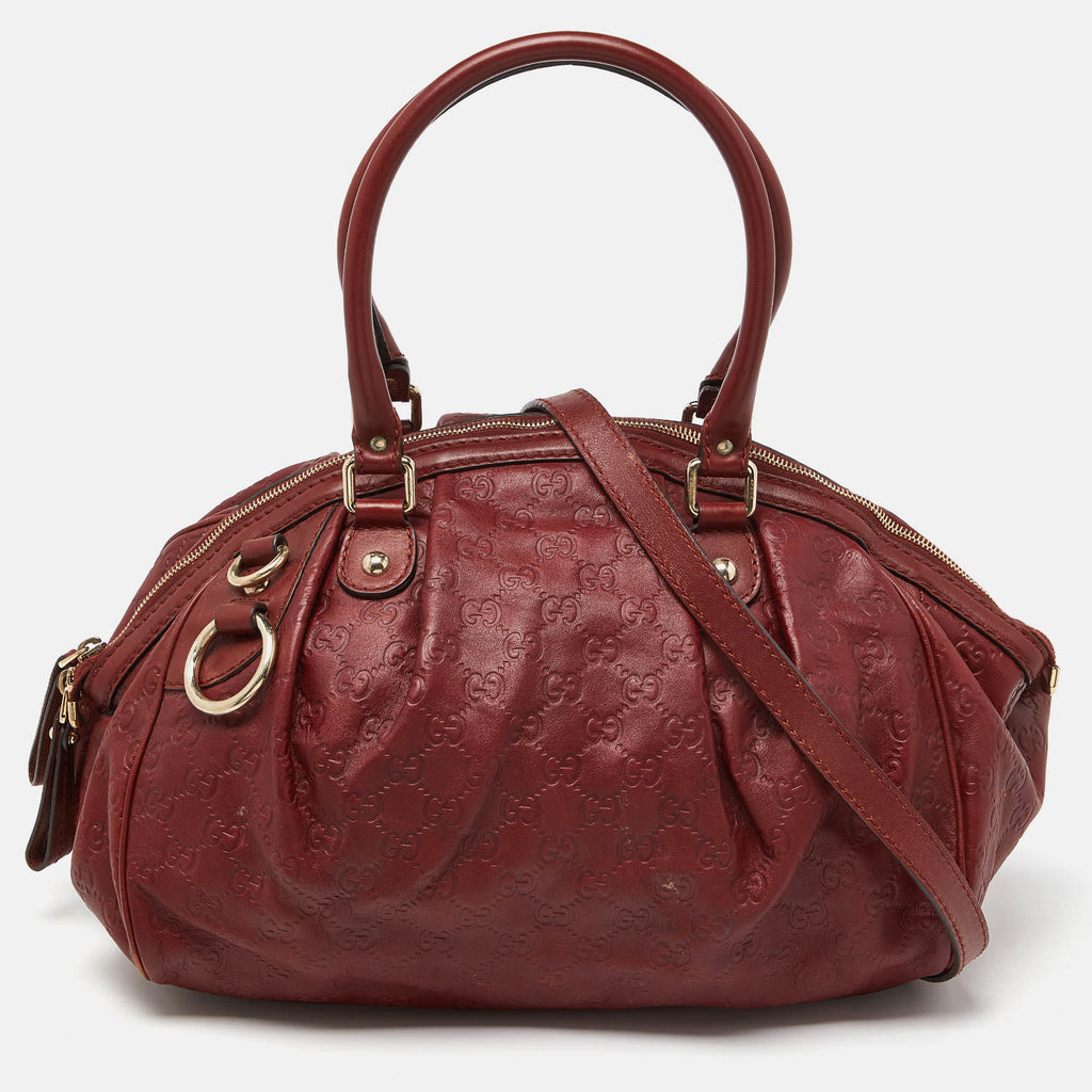 A: The Gucci Brick Brown Guccissima Leather Medium Sukey Boston Bag is crafted from high-quality Guccissima leather, which features a signature embossed pattern. This luxurious material is known for its durability and elegance, making it an ideal choice for designer luxury handbags.