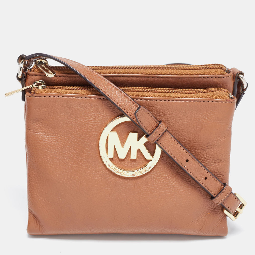Q: What are the functional features of the Michael Kors Brown Leather Crossbody Bag?