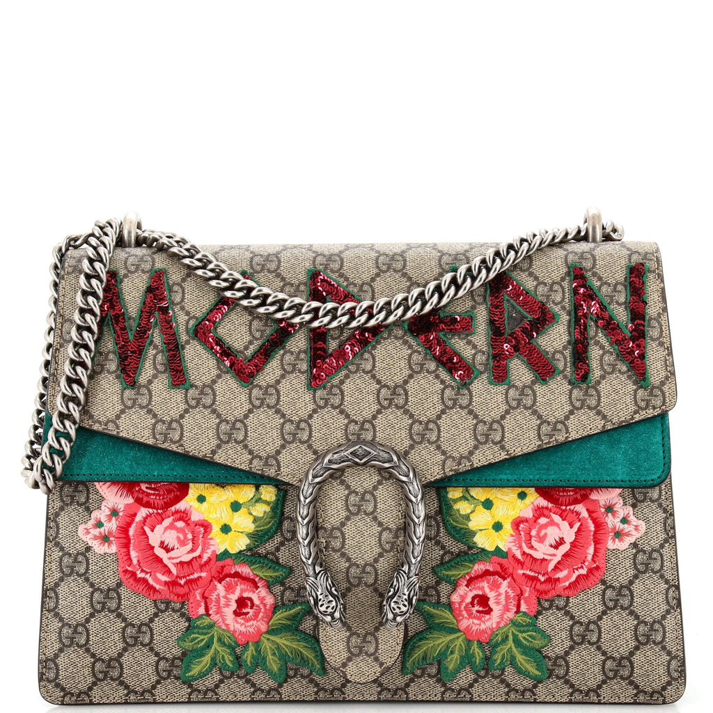 A: The Dionysus Bag boasts several unique features, including its distinctive tiger head closure, which symbolizes strength and power. The embroidered details add an artistic flair, while the combination of GG coated canvas and leather ensures both durability and luxury, making it a must-have in any designer luxury handbags collection.