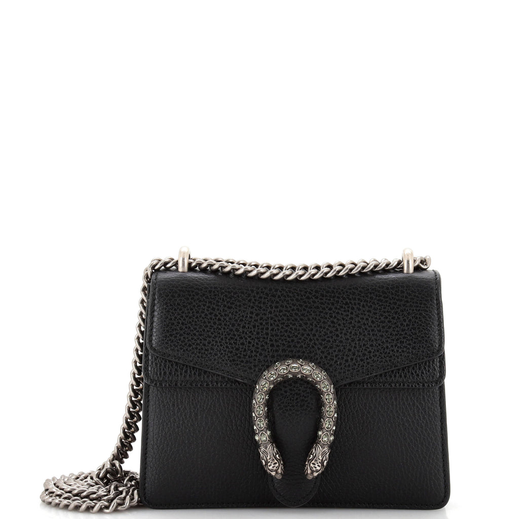 A: The Gucci Dionysus Bag Leather Mini features a distinctive tiger head closure, inspired by Greek mythology, which is both eye-catching and functional. The adjustable chain strap also allows for versatile wear as a shoulder or crossbody bag, adding to its appeal.