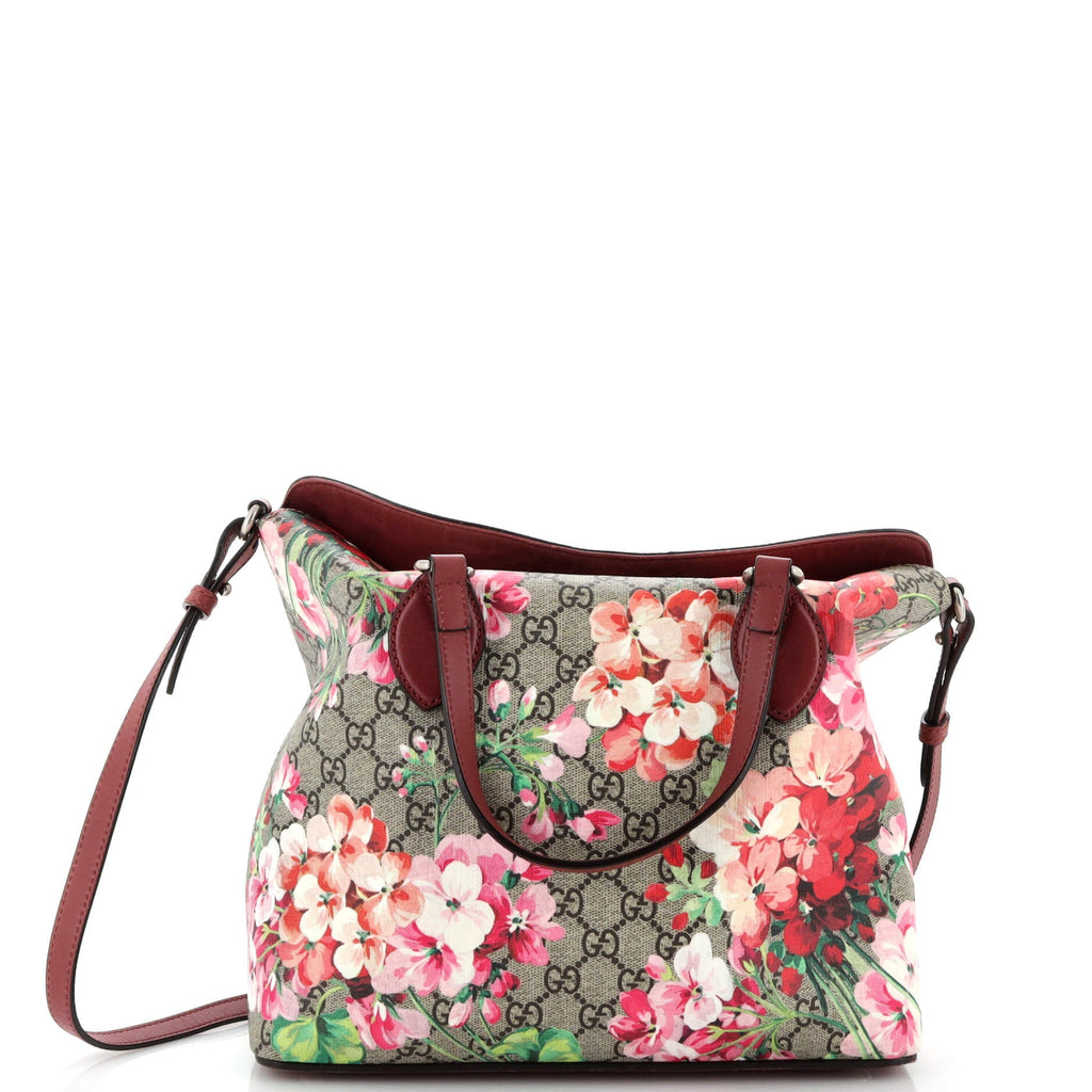 A: The Blooms print is celebrated for its vibrant floral design that adds a fresh and sophisticated touch to any handbag. This eye-catching pattern enhances the visual appeal of the Gucci GUCCI Signature Fold Over Tote, making it a standout piece in any luxury collection.