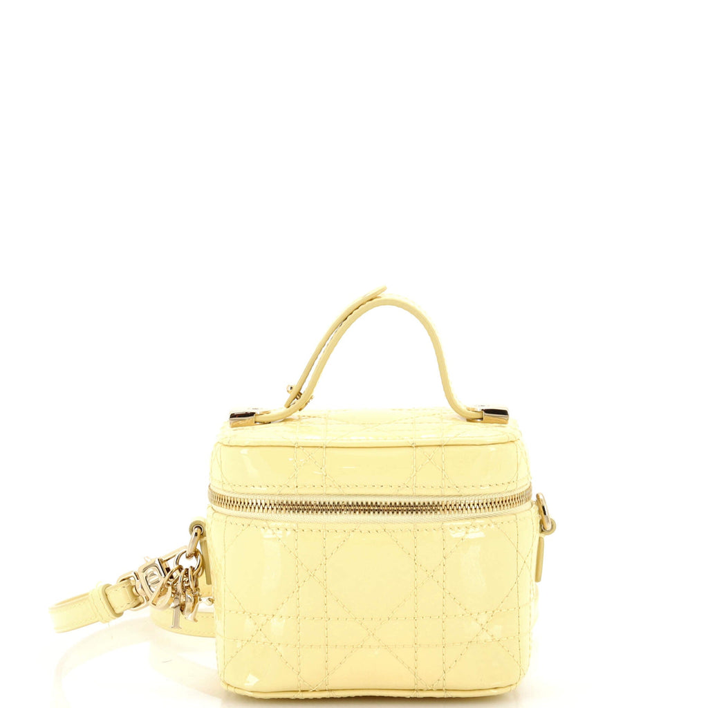 A: The Lady Dior Vanity Case Cannage Quilt Patent Micro is crafted from high-quality patent leather, featuring the iconic Cannage quilt pattern that adds both elegance and durability to this designer luxury handbag.
