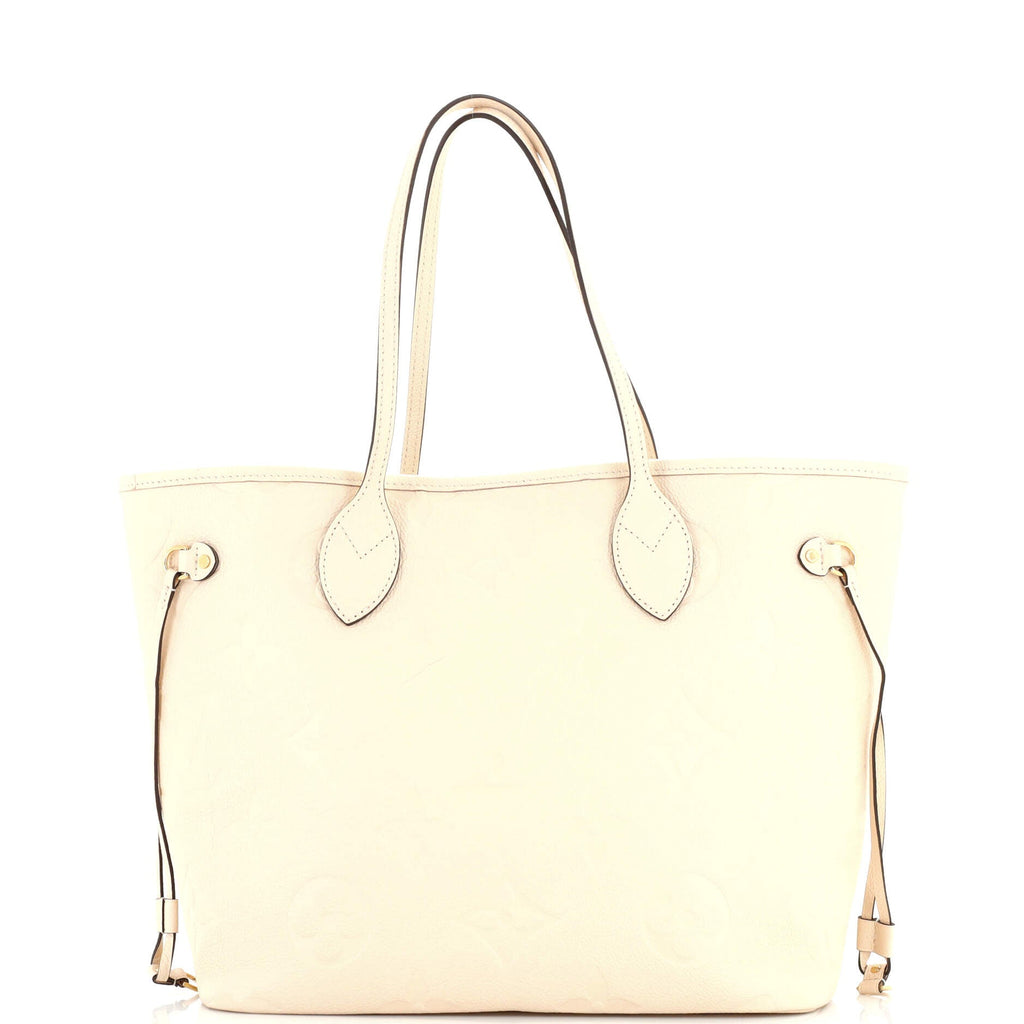 A: The Louis Vuitton Neverfull NM Tote Monogram Empreinte Giant MM is crafted from high-quality Monogram Empreinte leather. This luxurious material provides a soft texture while ensuring durability and resistance to wear, making it an ideal choice for designer luxury handbags.