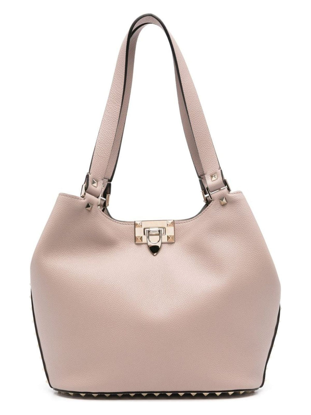 A: The Rockstud Small Tote Bag features a spacious main compartment with a zip closure, providing ample room for essentials while ensuring security. It also includes dual top handles for versatile carrying options and an optional shoulder strap for added convenience, making it ideal for both casual and formal occasions.